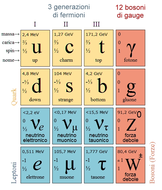 Più precisamente, come si può vedere in figura, le prime tre colonne riuniscono le 3 generazioni di fermioni, nelle prime due righe sono presenti i 6 sapori dei quark e nelle due successive i 6 sapori dei leptoni. La IV colonna invece elenca i mediatori dei vari tipi di forza: il fotone per quella elettromagnetica, 8 gluoni per quella di colore e i 3 bosoni Z0, W+ e W- per le quella debole.